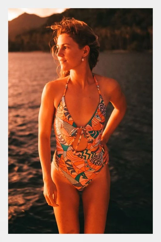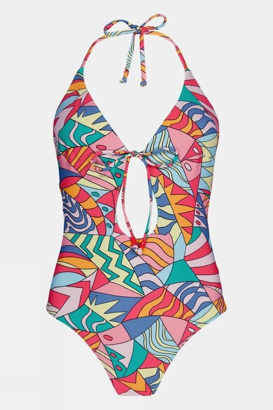 The Women’s Flinder Halter One Piece is an elegant swimsuit with a colourful geometrical all-over print, perfect for your next summer holiday. It has a beautiful stylish low V-neck, low back and a high cut leg to shape your body. The fixed soft chest paddings provide extra coverage while the adjustable neck and bust straps allow a perfect adjustment. A full lining and added stretch ensure comfortable feel.