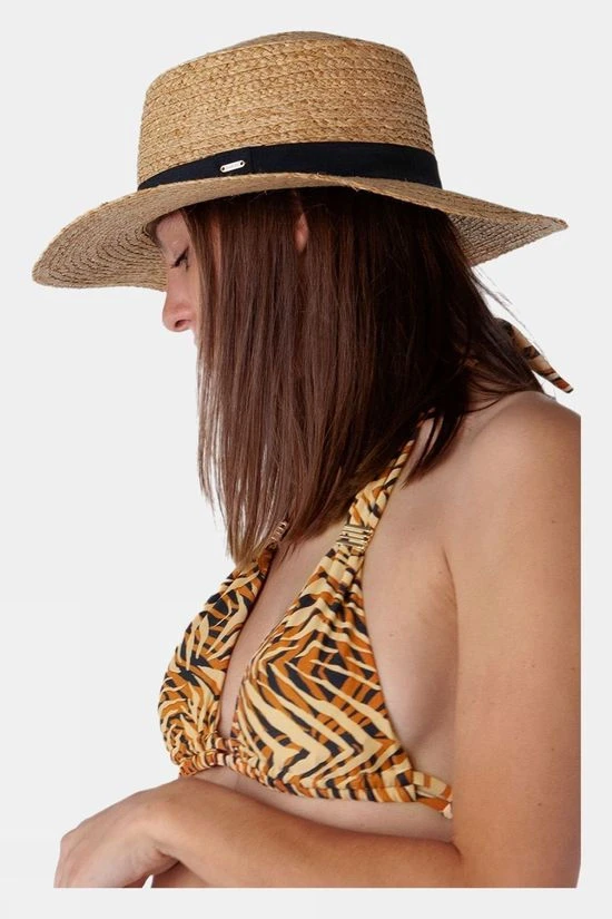 The Lottey Hat is a round hat with a flat top, made of raffia straw. The hat has a band around the crown and an adjustable inner band for a wide fitting range.