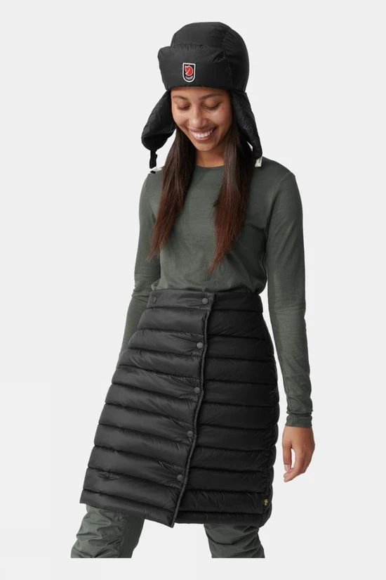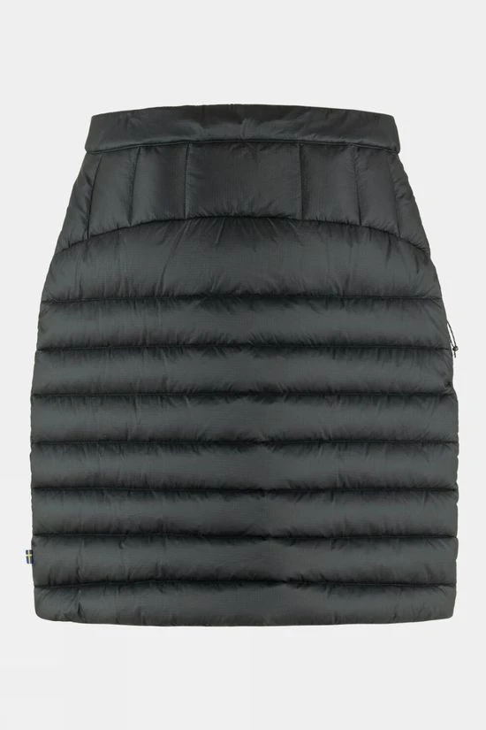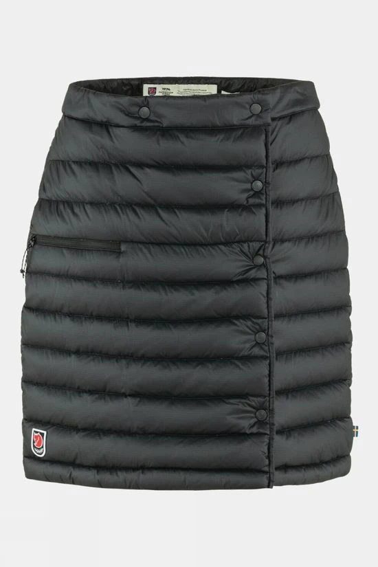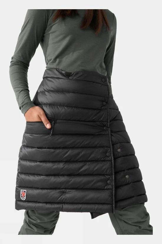 Lightweight, packable down skirt for outdoor and everyday use during winter. Easy to pull on when taking a break from skiing or skating, or for extra warmth on winter walks or cold commutes to work. Its flexible wrap-around design gives excellent range of movement and makes it easy to layer according to the temperature. The waistband is reinforced and has an elasticated drawcord for a perfect fit. The zippered pocket doubles as a pack bag, and has an inside mesh pocket for small items.