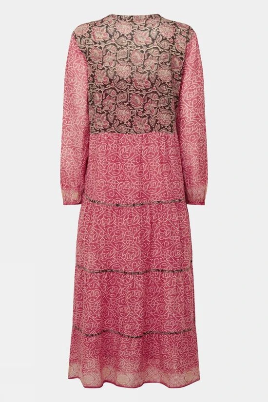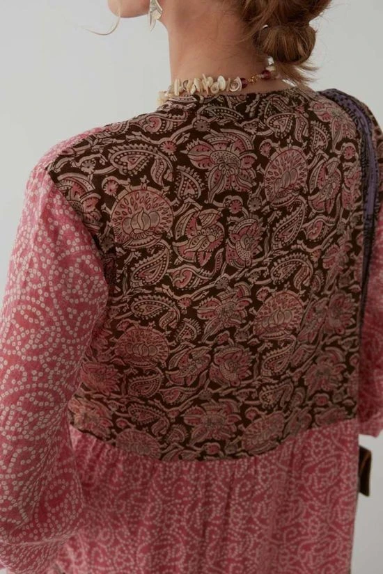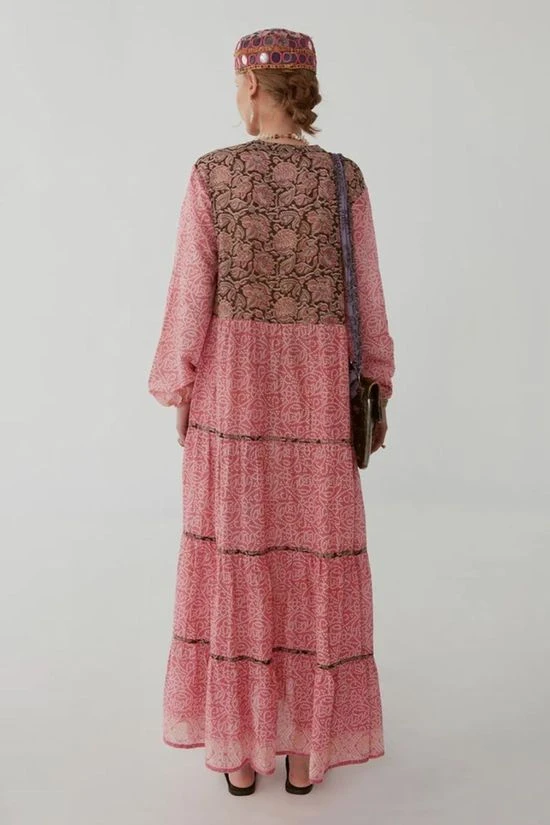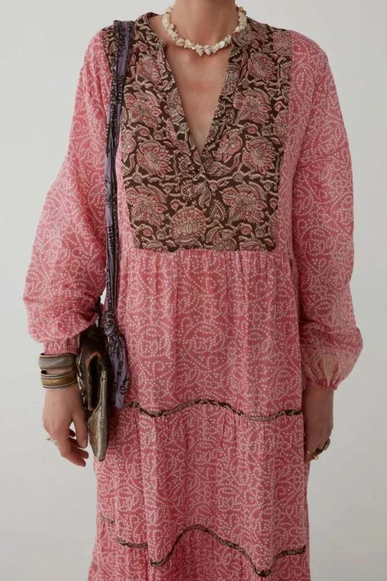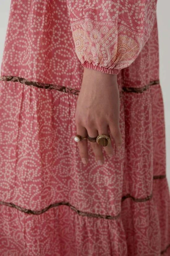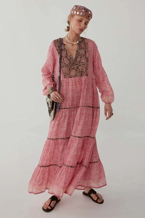 The Didi Dress from Maison Hotel. The beautiful print is brought to life with a contrast print on the upper back, chest and skirt bindings. Rendered in soft cotton voile, the dress has a relaxed silhouette, elastic cuffs and a separate cotton inner lining. Best paired with dark brown or black leather sandals.